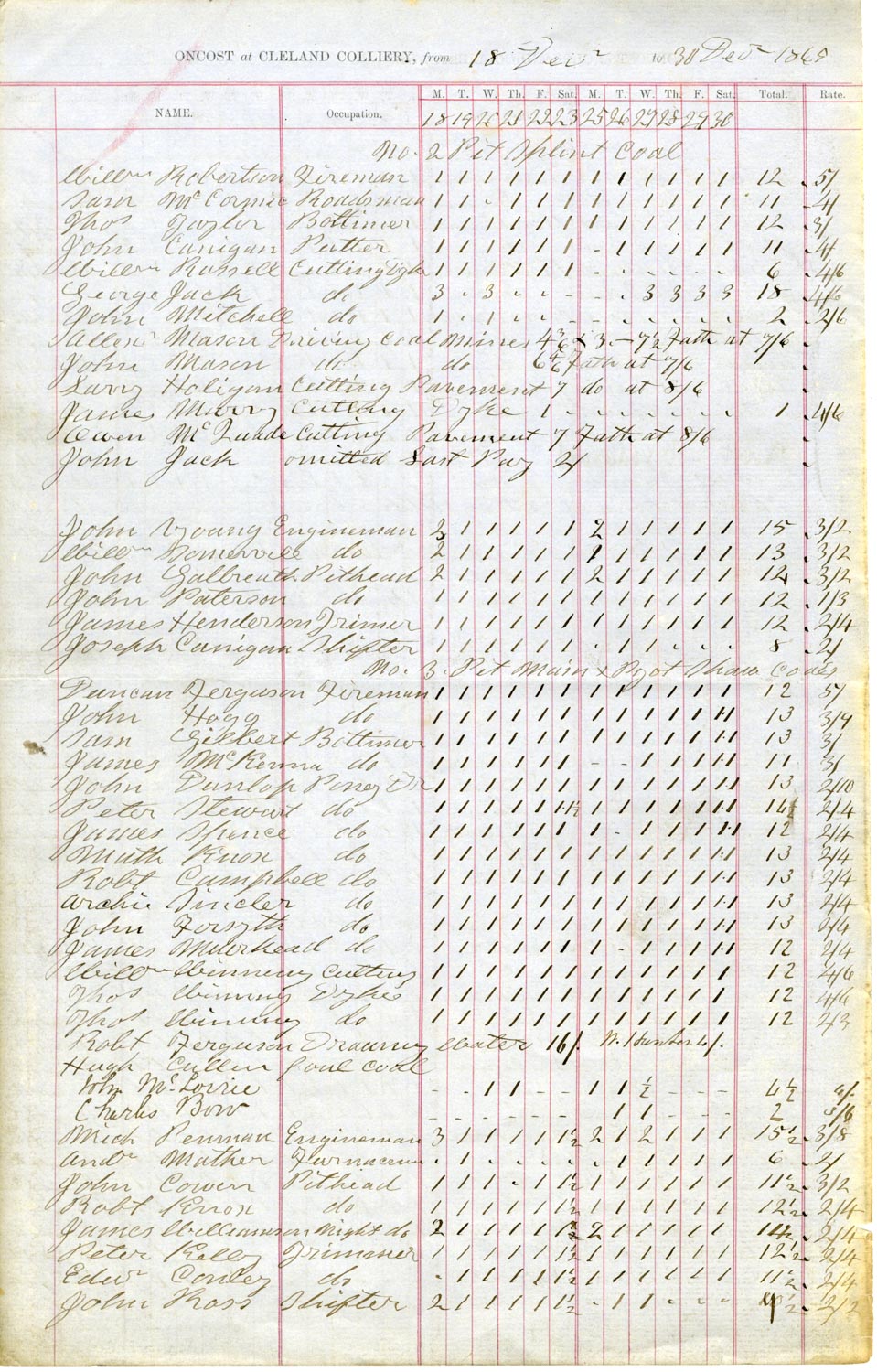 Document detailing oncost men at Cleland Colliery, 1849