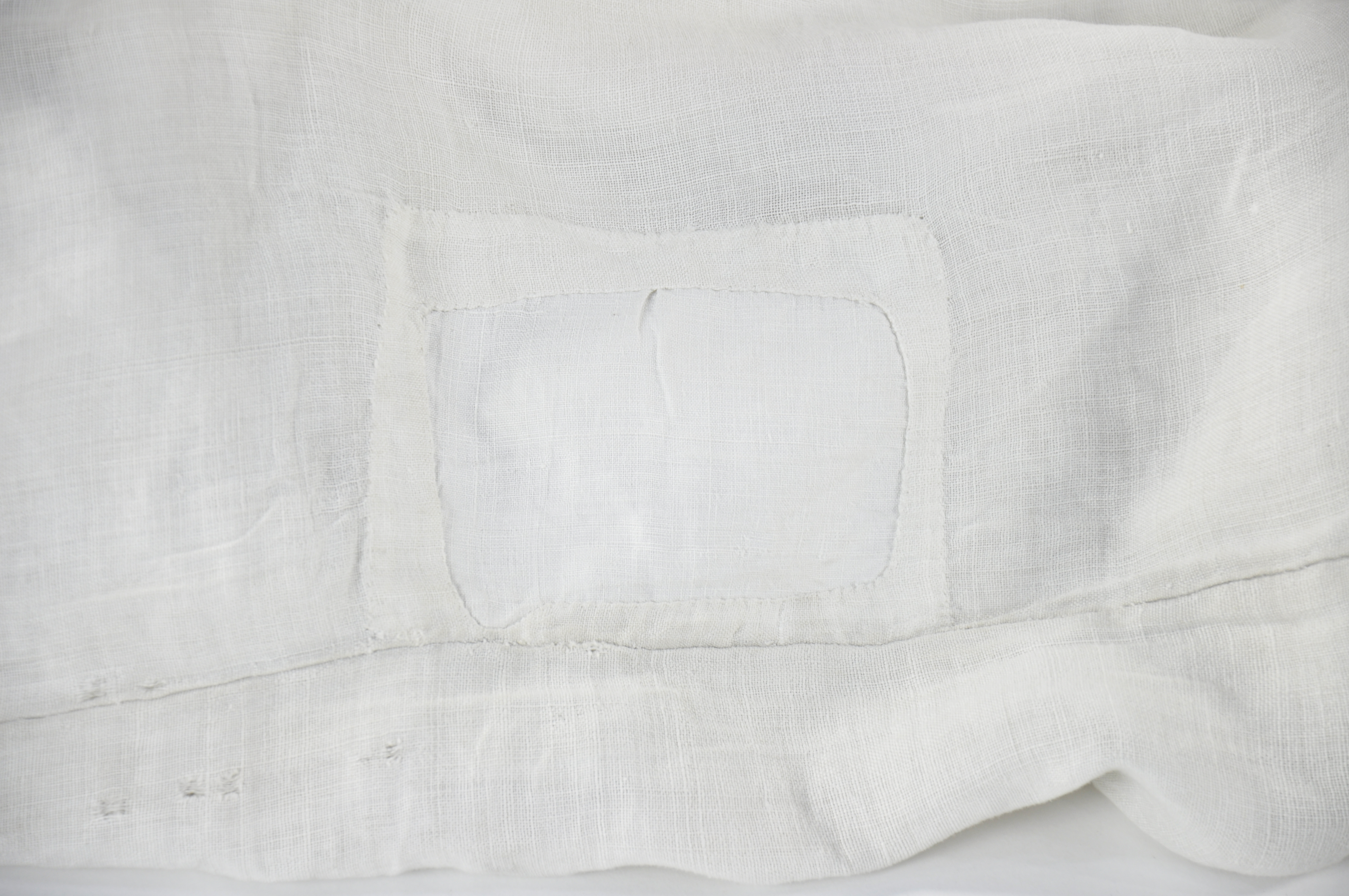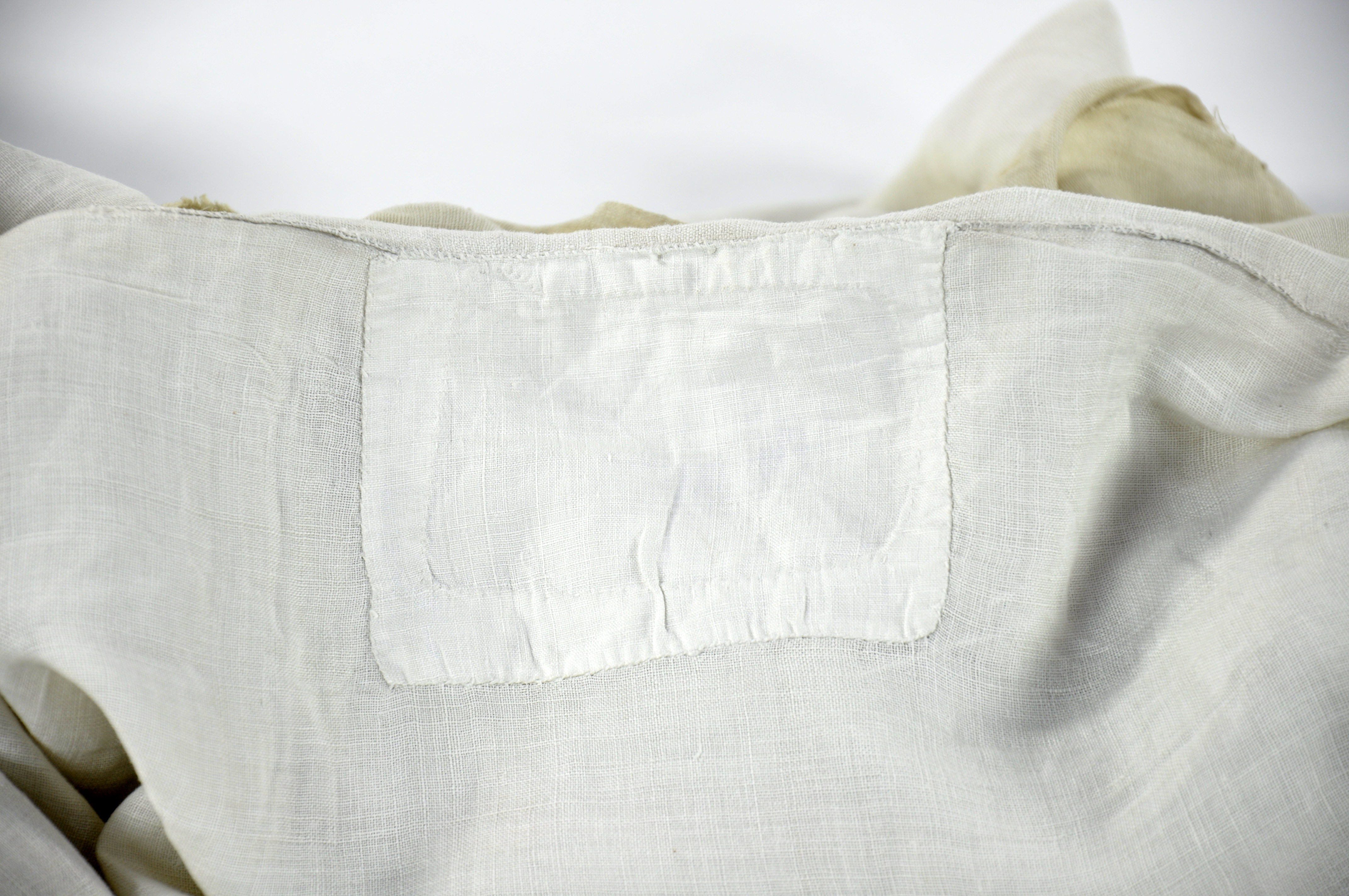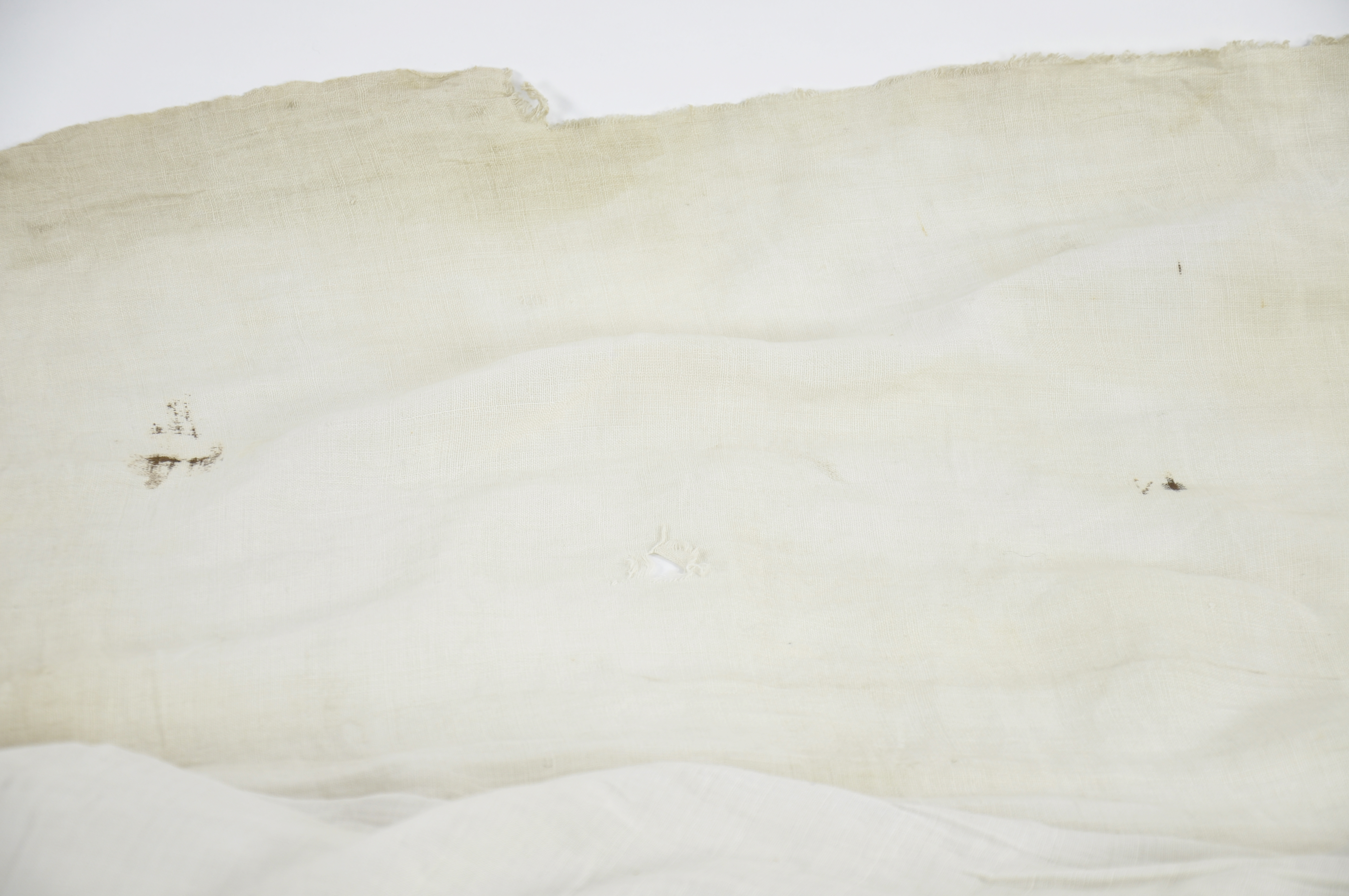 Off-white linen sheet reputed to have been the death shroud of the Covenanter John Whitelaw of Stand, who was executed for treason at Edinburgh's Grassmarket on 30th November 1683. It has been patched in the centre, with a relatively precise rectangle of the original fabric having been cut and removed. This is suggestive of a smaller piece having been removed by someone as a keepsake or token of a Covenanting relic.