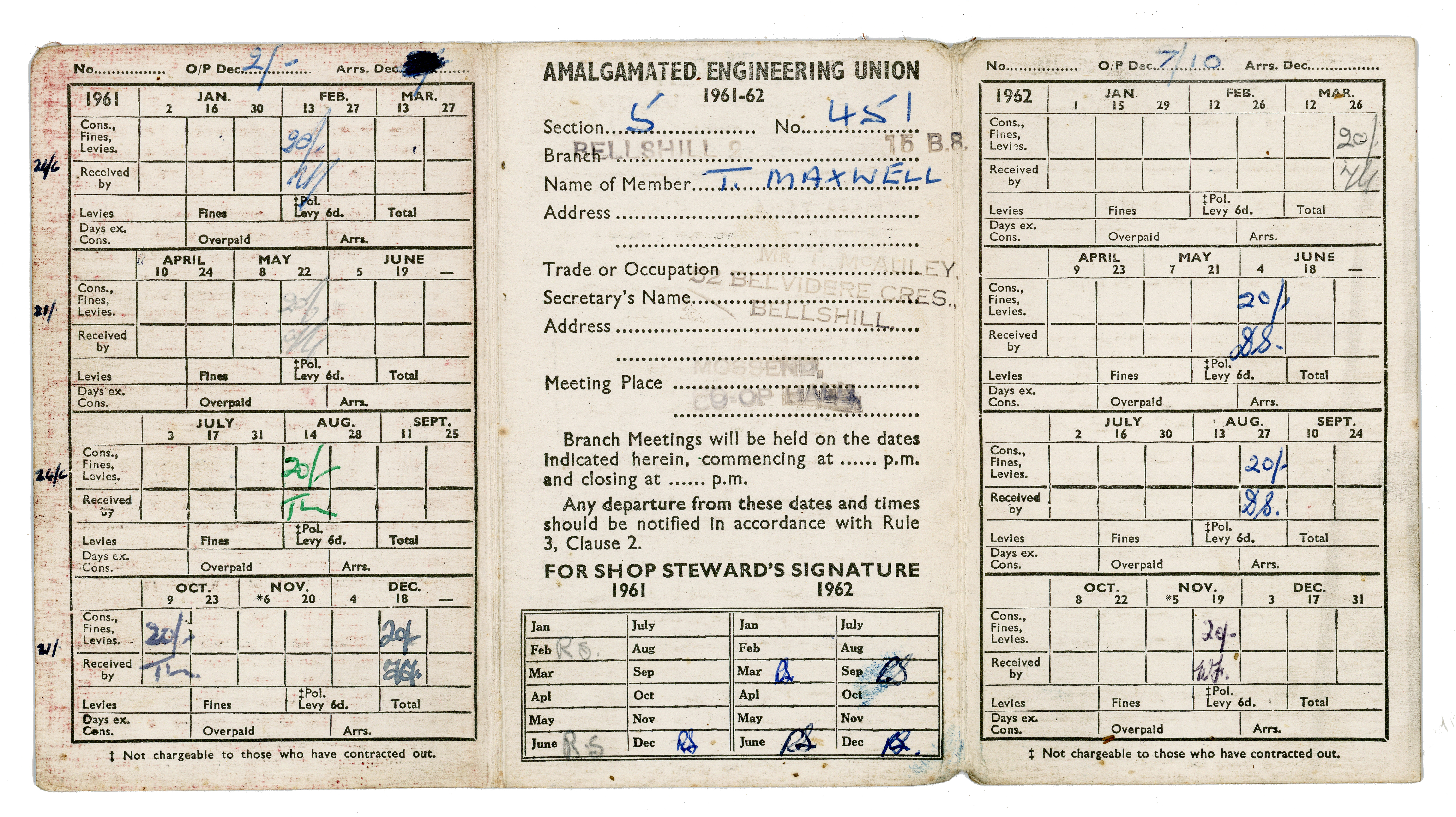 A membership card of the Amalgamated Engineering Union (AEU). This union's pedigree really goes back to the 1820s, but it existed under the AEU name between 1920 and 1968, absorbing many smaller unions under the name. After 1968, the union went through a series of transformations, taking on many different names as it merged with various other unions.