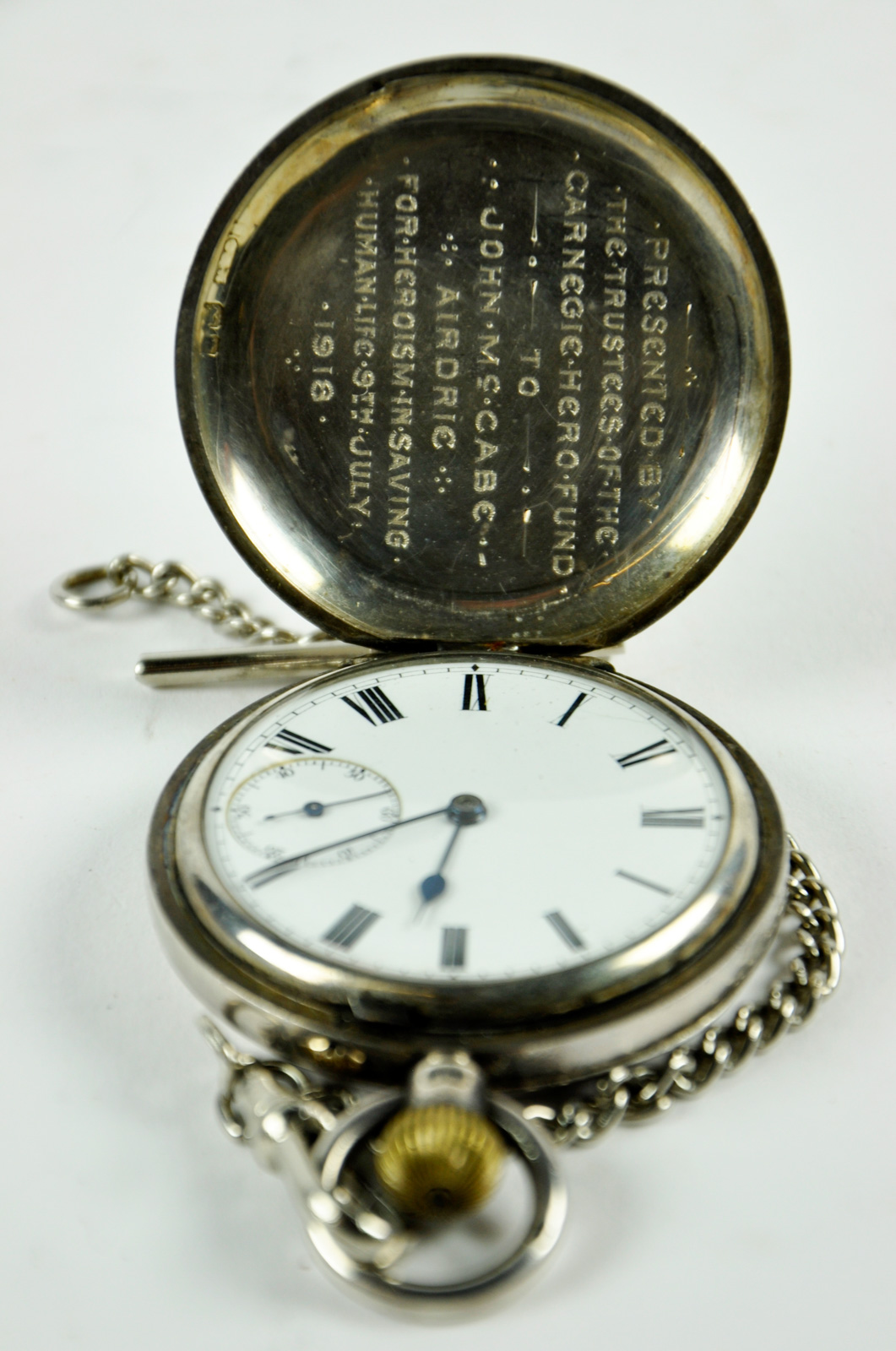 This watch was presented to John McCabe by the Carnegie Hero Fund Trust. There is an etched inscription inside the lid reading: "PRESENTED BY / THE TRUSTEES OF THE / CARNEGIE HERO FUND / TO / JOHN McCABE / AIRDRIE / FOR HEROISM IN SAVING / HUMAN LIFE 9TH JULY / 1918".