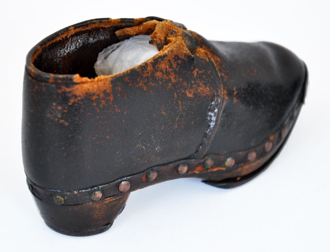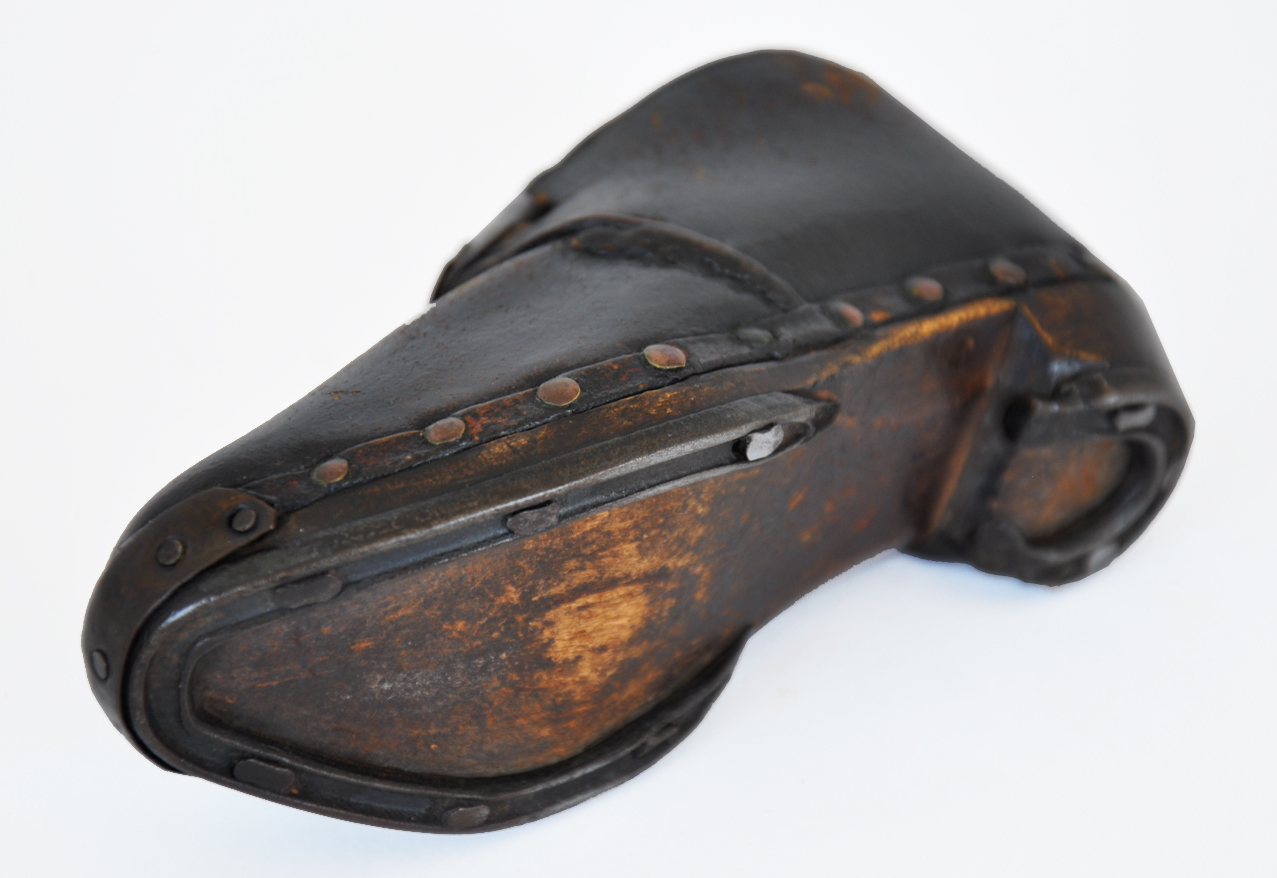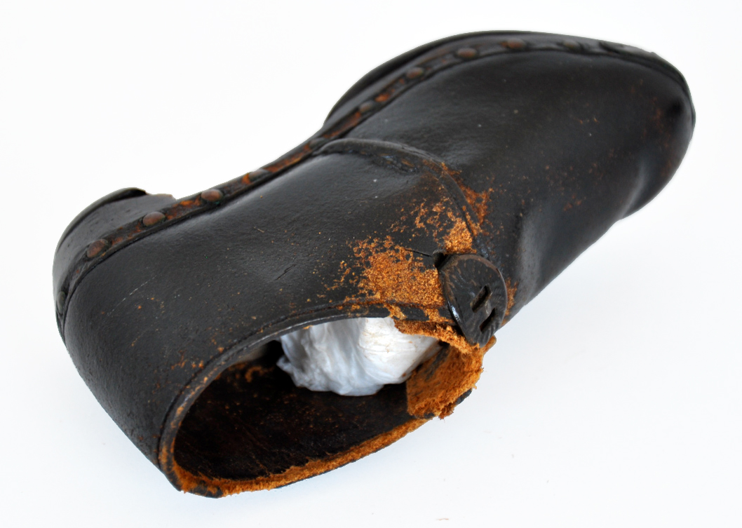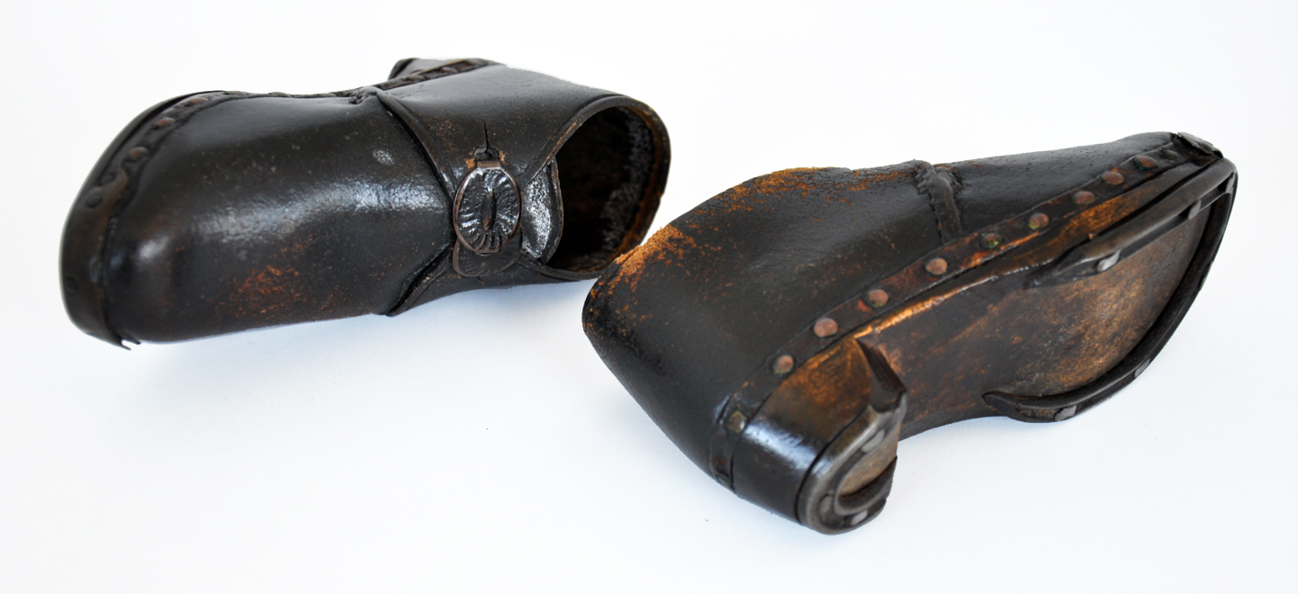 These leather boots have horse-shoe style iron plates on their soles to protect them from wear. Pair of hand-made leather children's boots dating from 1870. Horse shoe style iron plates protect the wooden soles, the leather is fastened to the sole by metal rivets and the boots fasten by two oval hooks at the instep. The high heel, traditionally used in riding boots, is another clue as to its intended use.