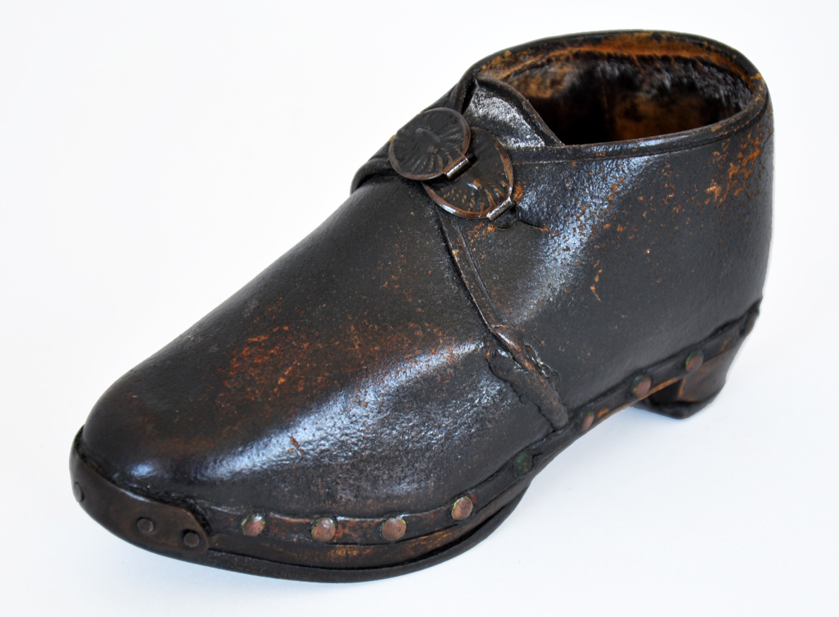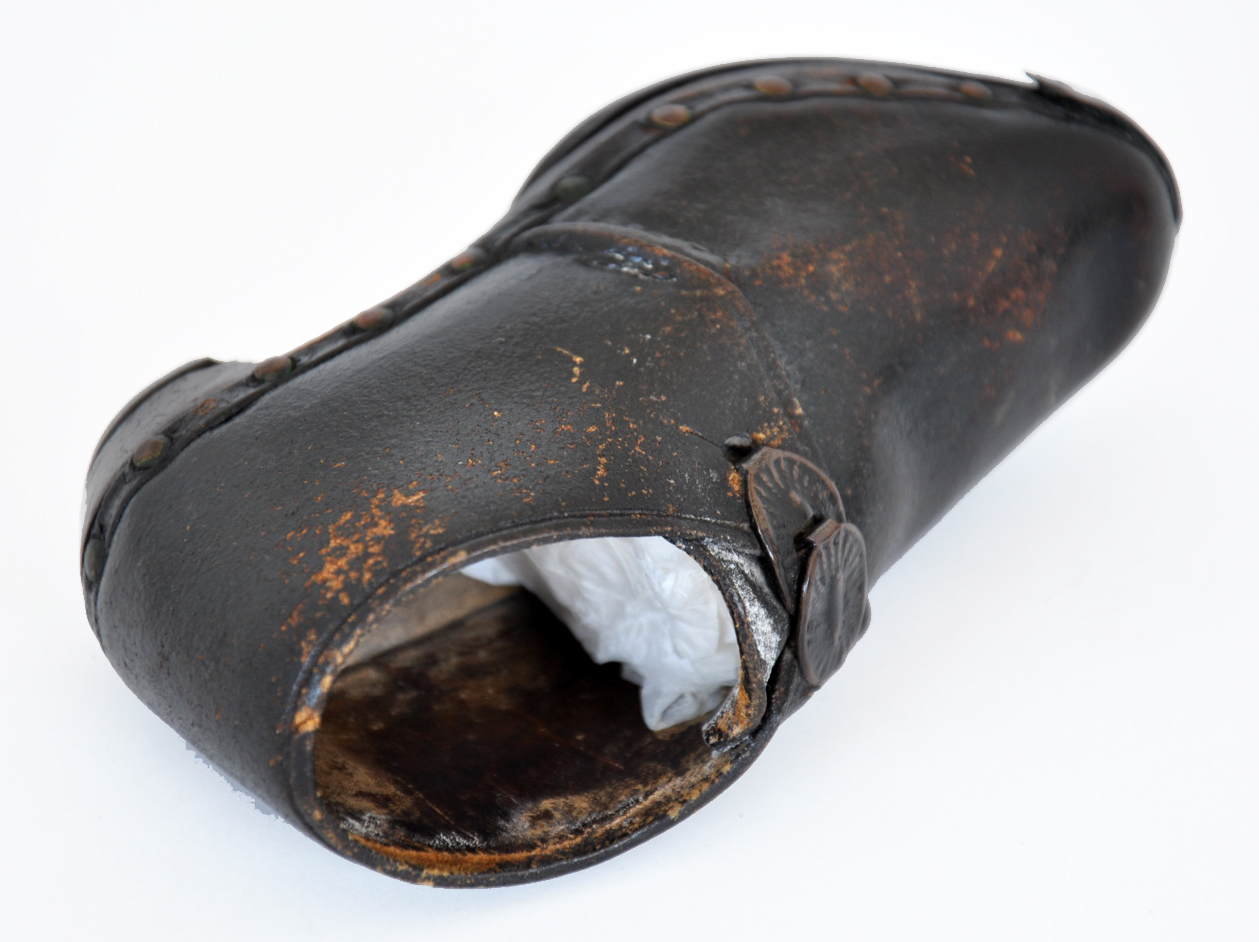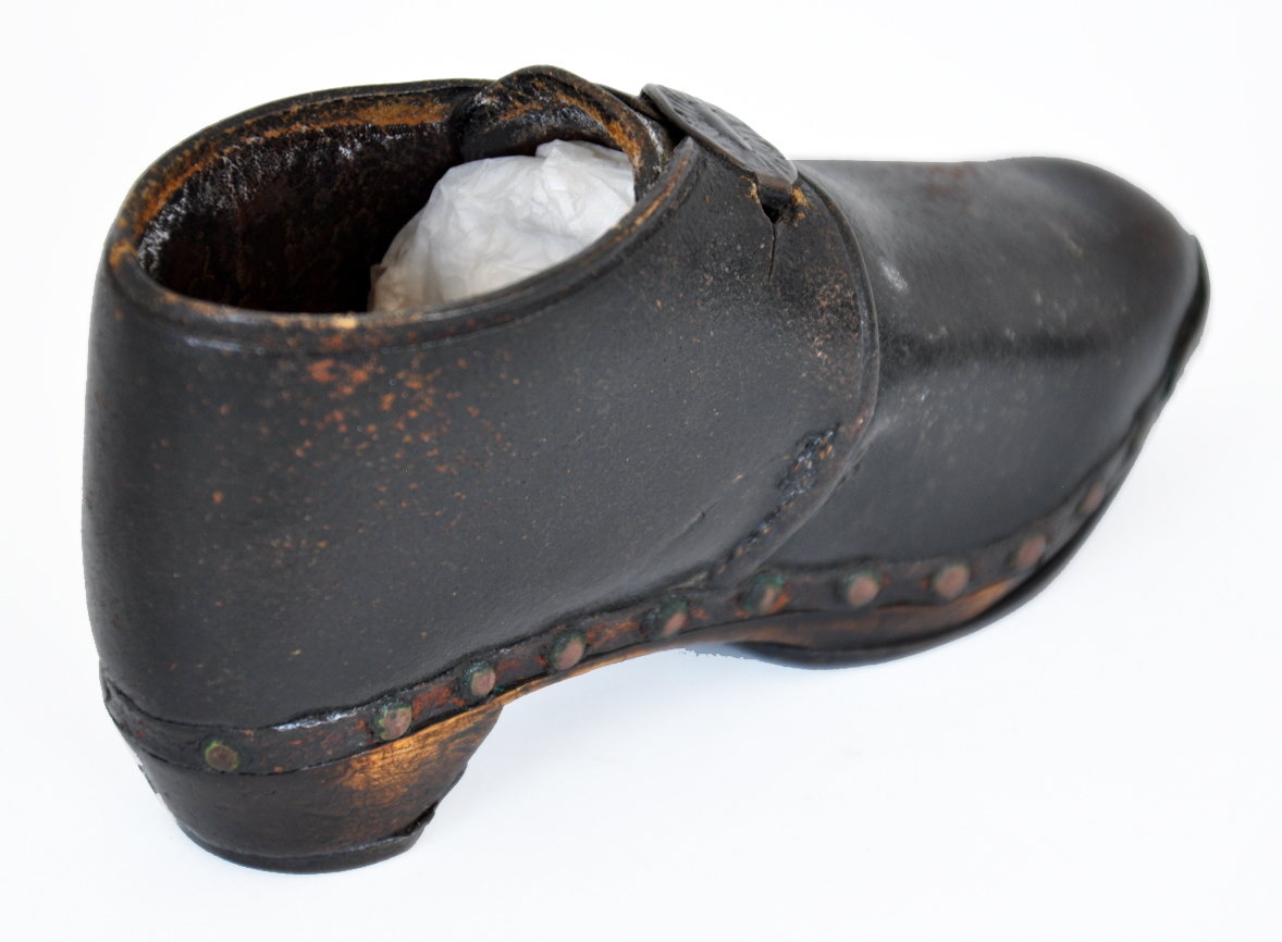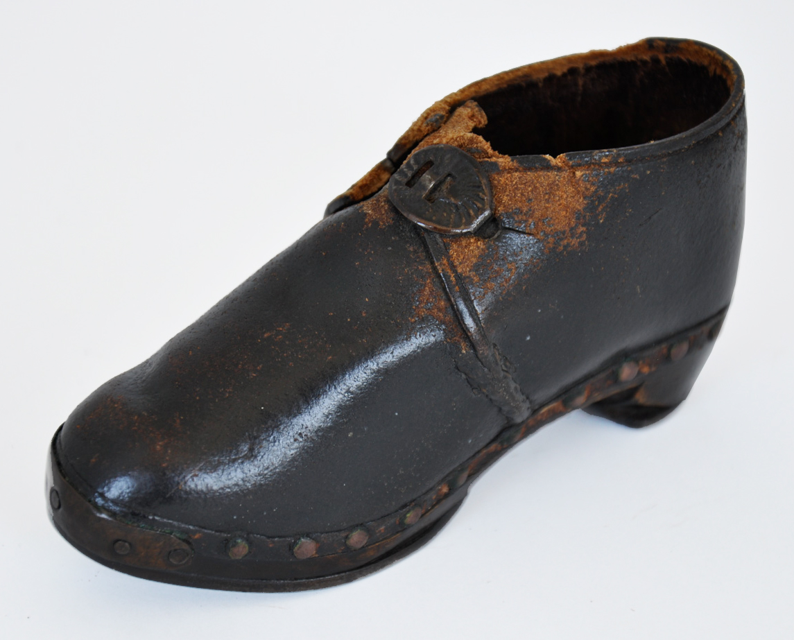 These leather boots have horse-shoe style iron plates on their soles to protect them from wear. Pair of hand-made leather children's boots dating from 1870. Horse shoe style iron plates protect the wooden soles, the leather is fastened to the sole by metal rivets and the boots fasten by two oval hooks at the instep. The high heel, traditionally used in riding boots, is another clue as to its intended use.