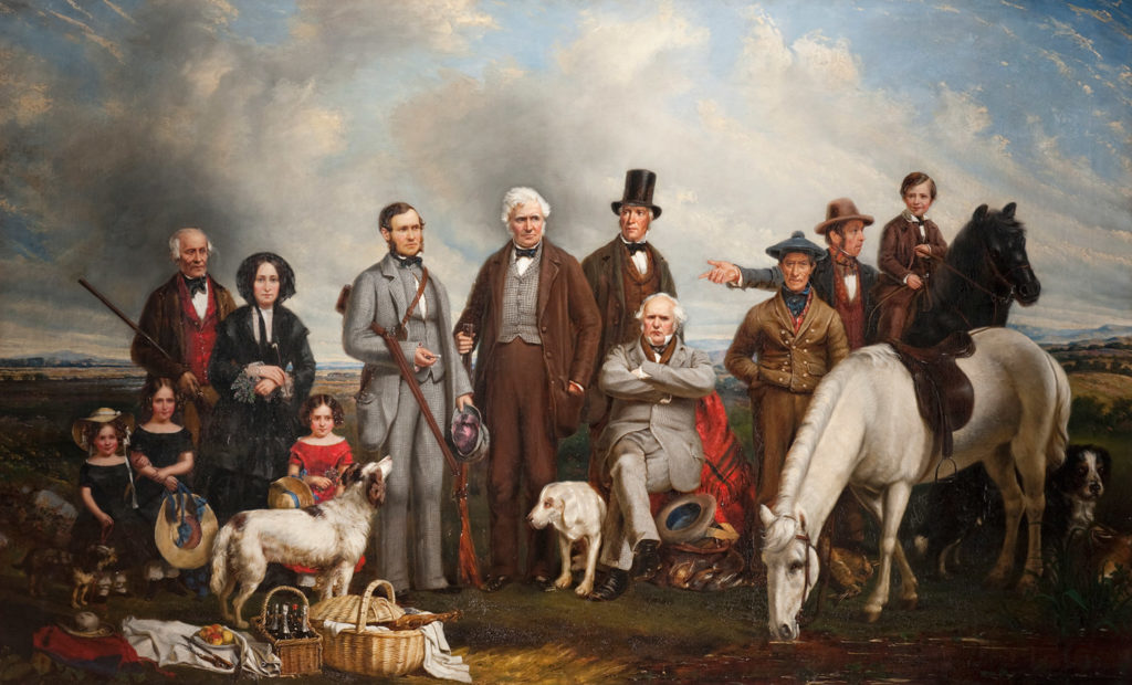 So we now have evidence of the ownership of the paintings by the Mitchell family, and an image of the family, including Anne Rankin’s father JT Rankin, who was Provost of Airdrie at the time.  He is probably responsible for commissioning both paintings – in the Curlers at Rawyards painting he is the central figure in bright red.