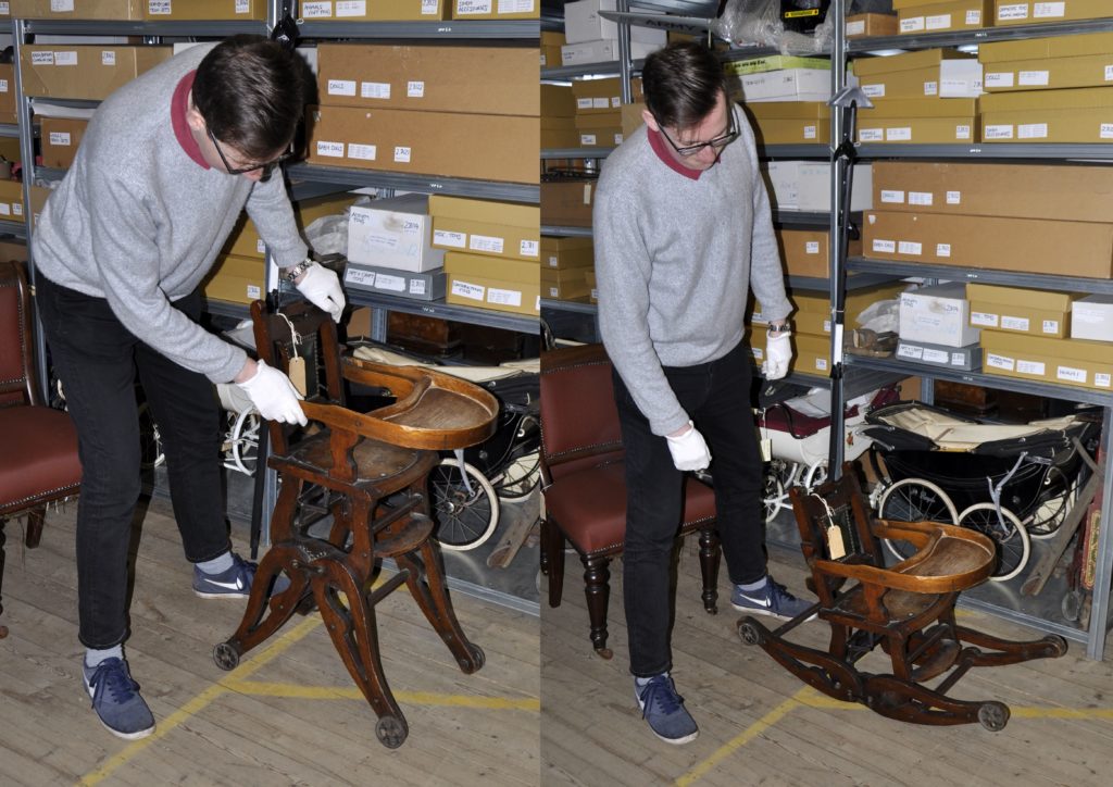 One that I had picked out, a child’s high chair, didn’t have a huge amount of information on the object record although we knew it was from a family in Coatbridge. However on sighting it in the store there was something quite appealing about it. Visually it looked pretty good, so I wanted to find out more.