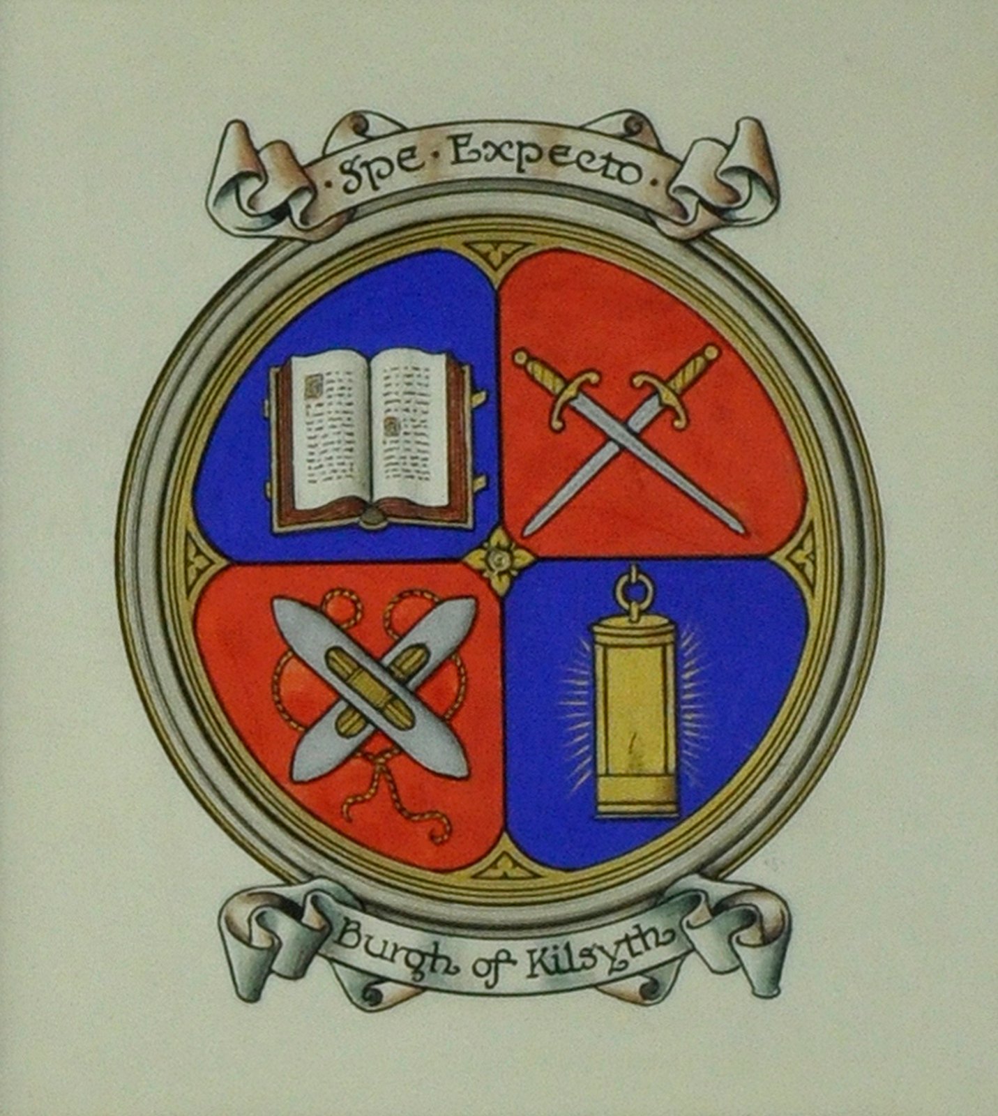 When the Scottish Burghs lost their status during the local government reorganisation of 1975, their Armorial Bearings reverted to the Crown. Kilsyth Community Council petitioned the Court of the Lord Lyon for the motto to be changed from Spe Expecto (‘I look forward in hope’) to Spe Expectamus (‘We look forward in hope’) to include the whole community. The coat of arms, granted by Lord Lyon King of Arms in 2002, largely maintained its traditional form but is now surmounted by a coronet of pine cones and holly leaves, denoting it as belonging to a community council.