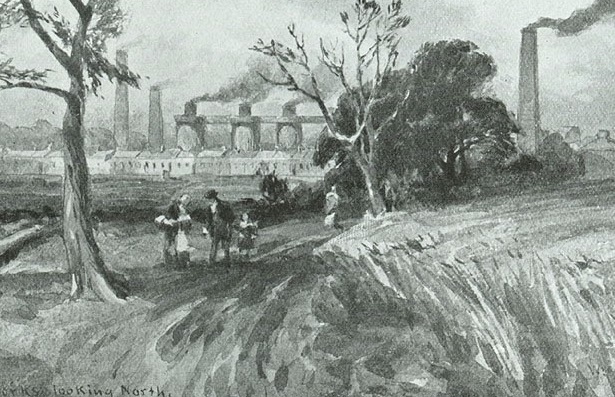 Govan Iron Works looking North, drawn by William Simpson in the late 1840s. The row of single-storey ironworkers’ houses in front of the works was called Alexander Row. Soon a malleable iron department would be built in the field to the left.