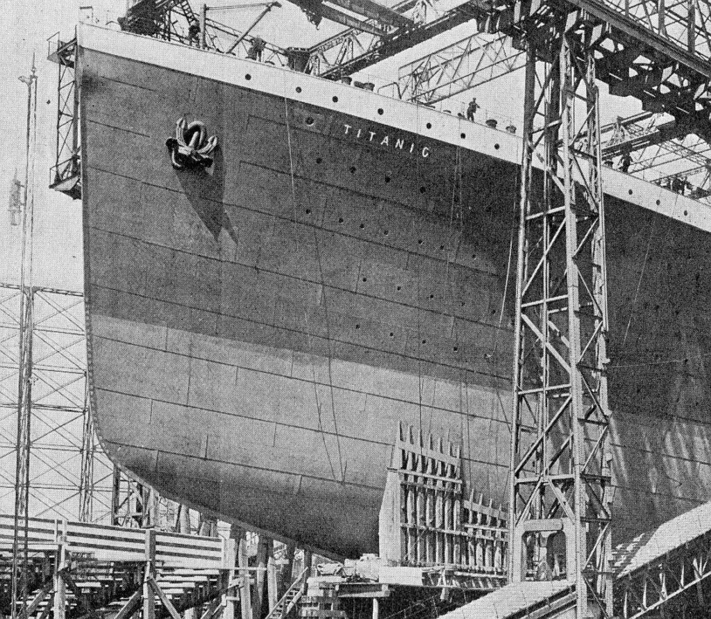 The Titanic on the slipway, nearly ready to launch. The steel plates of the hull were between 2.5 and 3.8mm thick.